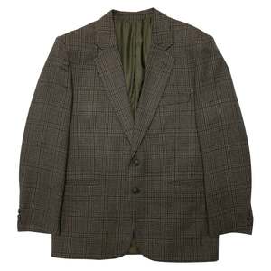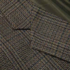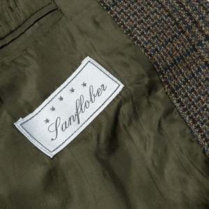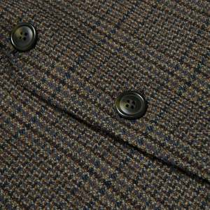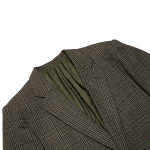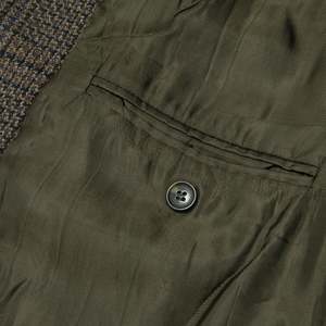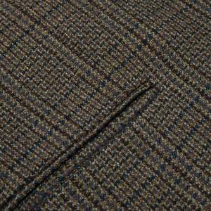 This Sanflober tweed sports jacket represents a refined interpretation of classic menswear, rooted in German tailoring traditions. Designed for casual and semi-formal settings, it features a dark-toned Glen plaid pattern with structured shoulders and a tailored fit. The jacket includes a two-button, single-breasted design, notched lapels, a single rear vent, two flap pockets, and a welted breast pocket. Constructed with a semi-canvassed method, it balances shape retention with comfort. The fabric is a medium-weight wool tweed with a Glen plaid pattern in earthy tones, woven in a twill base for durability and drape. The interior is lined with a muted olive-green synthetic fabric for breathability and smooth layering. This versatile piece exemplifies refined menswear with timeless appeal.