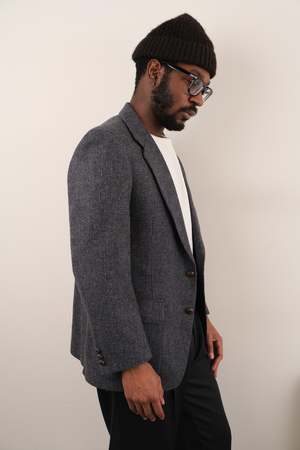 Cut from medium gray pure new wool, this blazer feels softly structured with a textured weave that reads crisp and tailored. Designed with notch lapels, a two-button front, and clean flap pockets for an easy, straight silhouette. Pair with button down shirts and pleated trousers for a refined everyday look. Made with quality in the USA. Tag size reads 40S fits up to M. Measurements Shoulder: 18 in. Chest: 44 in. Sleeve: 24 in. Length: 29 in. Model is a size 32 in. waist and stands at approximately 6 feet. Although we do our best to ensure each item is in excellent condition, please respect any minor flaws due to the item's vintage character. Vintage 1990s gray pure new wool blazer with a two-button front, notch lapels, and a softly structured tailored fit.