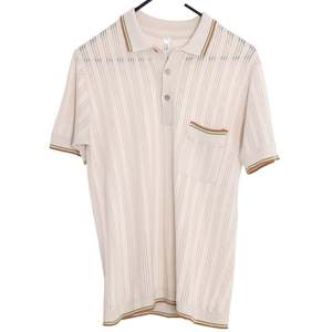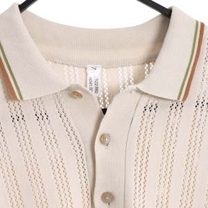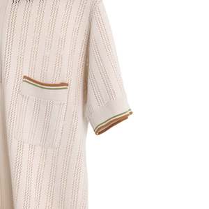 Numeric sizing and serial codes reveal its catalogue-era origin, rooted in West Germanys regulated, pre-brand retail infrastructure. The West German short-sleeve knit polo in question stands as a paradigm of 1970s continental textile engineering, where postwar industrial precision met aspirational leisurewear aesthetics. Emerging from a period in which West Germany had established itself as a central node of technical knitting innovationsecond only to Italythis garment exemplifies the regions prowess in synthetic yarn manipulation, circular knitting technology, and mid-century modern form language. Devoid of overt branding yet rich in structural intentionality, the piece speaks to the standardized, semi-industrial knitwear practices dominant in the German-speaking markets during the 1960s and 1970s. The absence of a logo2, combined with a numerical sizing system and serial-style internal codes (822.662 / 8041.501), aligns with garments produced under department store or catalogue distribution systems, such as those used by Karstadt, Woolworth Germany, or Kaufhof. These codes functioned less as marketing tools and more as identifiers within tightly controlled textile manufacturing ecosystemsused for inventory control, reordering, and compliance with post-1960s German textile classification standards. This type of tagging reflects a pre-brand-driven retail culture, where product lineage was internalized by supply chains rather than externalized for consumer recognition. Structurally, the garment exemplifies Euro-leisurewearan understated yet technically complex genre of mid-century fashion that synthesized mod-adjacent sharpness with warm-weather comfort. It is classified as a mens short-sleeve knit polo shirt, purpose-built for casual daytime settings, from garden terraces to lakeside resorts. The design intent is to offer ventilation, ease, and subtle elegance, rendered through technical knit structures and restrained color logic. The silhouette is defined by a straight torso block with minimal shaping, a long torso cut typical of 1970s proportions, and set-in sleeves that integrate seamlessly with the rib-knit collar and cuff finishes. The body is likely circular knitsuggesting a tubular form that minimizes side seams and reinforces both shape retention and comfort in motion. From a construction standpoint, the garment relies on chainstitch or coverstitch seaming, with flat-seamed joins for durability and subtle elasticity. The fully fashioned knit placket is reinforced with interlining to stabilize button stress pointsan engineering choice consistent with West German manufacturing standards of the period. The rib-knit collar, detailed with ochre and olive green stripe tipping, is proportioned for softness without collapsing, and the clean set-in junction between the collar and the jersey body signals disciplined attention to seam architecture. Hem and sleeve cuffs are executed in a double-rib finish, further stabilized by knit-in stripe accents, producing both structural compression and decorative rhythm. Visually and technically, the shirts most distinctive feature lies in its alternating vertical bands of jersey rib and pointelle lace stitchan openwork pattern that serves dual roles of ventilation and aesthetic modulation. These panels create subtle shifts in opacity and texture, evoking both modernist textile experimentation and machine-age visual language. The left chest pocketfully fashioned and likely knit as a separate panelis top-edged with the same stripe motif as the collar, contributing to an overall sense of pattern unity and proportional restraint. Two-hole resin buttons in faux mother-of-pearl deliver a period-authentic fastening solution with minimal aesthetic interference. The yarn composition is most plausibly a cotton-viscose or cotton-polyester blend, common in 1970s West German knitwear for balancing cool handfeel, breathability, and dimensional recovery. With an estimated GSM of 150180, the fabric qualifies as a midweight summer knitlight enough for heat dispersion, yet structured enough to resist cling or collapse. Elasticity is engineered into cuffs and hem, while the collar relies on tighter gauge density for shape maintenance. These features reflect West Germanys emphasis on material efficiency, garment longevity, and consumer practicality. The knit gauge, estimated at 1214, supports fine but visible stitch definition, ideal for integrating both ribbings and pointelle without puckering or distortion. Pattern alignment is rhythmically symmetrical, with vertical stripes calibrated to preserve visual order from shoulder to hemagain a reflection of the periods design logic, which favored engineered patterning over printed motifs. Seam junctions, particularly where ribs meet lace panels or where pocket panels attach to the torso, are clean and undistorted, indicating precise tension management and production oversight. In conceptual terms, the shirt embodies a psychological language of approachability, technical confidence, and understated masculinity. The open-knit panels evoke breathability and lightness; the earth-tone striping anchors the garment in nature-derived familiarity. Together, they project a controlled casualnesspart sport, part smartwearintended to affirm the wearers cultivated ease. This duality situates the garment at the nexus of mod revivalism, sportcore prefigurations, and postwar continental minimalism. Artistically, the piece draws from three overlapping aesthetic currents: postwar functionalism, sport-leisure elegance, and proto-retro futurism. The engineered knit patterning, rib transitions, and geometric stripe rhythm suggest a visual language attuned to architecture and mechanical repetition. At the same time, the garment abstains from overt stylization, channeling energy instead into the refinement of form and detail. This design ethos anticipates the 21st-century revival of modcore and golfcore, now seen in labels such as Percival, Gabicc