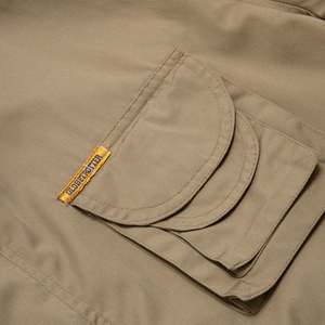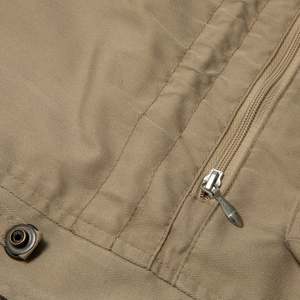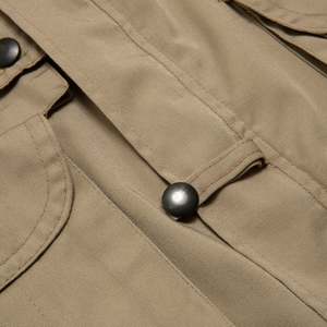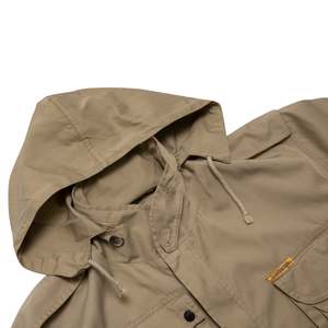 This 70s vintage field jacket by GLOBETROTTER is crafted from durable twill weave cotton. Designed with a structured silhouette and multi-pocket layout, it reflects a blend of military and safari aesthetics. Features include a button-and-zip front closure, storm flap, drawstring-adjusted waist, concealed hood within the collar, and epaulets on the shoulders. The fabric's twill weave ensures flexibility and durability, making it suitable for transitional seasons or layering. Additional details include reinforced stitching, adjustable sleeve cuffs, and a slightly extended hemline for added coverage.