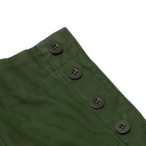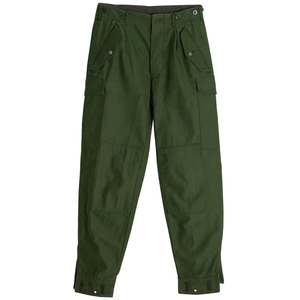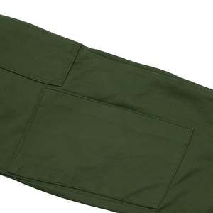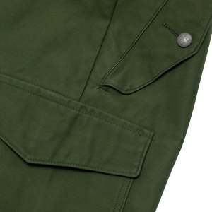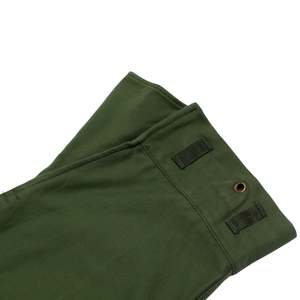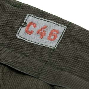 DDR combat trousers engineered for endurance, not expressionmodular, reinforced, and ideologically pure in their structural military logic. The Cold War-era East German field trousers, attributed to state-controlled uniform production systems such as OGFE (Oberbekleidungsbetrieb Gera-Finsterwalde Einheit), exemplify the apex of collectsivized military garment engineering. Devoid of designer authorship and commercial branding, the trousers embody the DDRs ideological commitment to functional standardization, mass replicability, and structural endurance. Every elementfrom the reinforced fly construction to the modular utility pocketsreflects the rigor of military-grade design filtered through socialist production values. Constructed as mens combat trousers, the design language is unmistakably utilitarian. The pattern emphasizes a straight-leg silhouette with extended rise, wide hip allowance, and flat front and back panels absent of dartsstreamlining production and enabling uniform sizing across ranks. Multi-panel construction is deployed to enhance durability, mobility, and repairability, with articulated knee patches externally applied for abrasion resistance and cargo panels grafted into the side thigh zones for gear storage. The overall form is geometrically assertive yet practical, relying on volume distribution and reinforced seam logic rather than stylistic embellishment. Seaming throughout the garment is executed with industrial precision. All high-tension zonesincluding the seat, inseam, outseam, and fly closurefeature either flat-felled or double-needle lockstitching with overlocked reinforcement where appropriate. Stitch density and backtack positioning are consistent, suggesting calibrated machine tolerances. The five-button fly is vertically aligned and reinforced with a facing placket; buttonholes are machine-bound with dense zigzag stitching and reinforced at both ends. Waistband construction is single-piece, internally interfaced, and topstitched for structure, featuring flat four-hole buttons and bar-tacked tabs for strength. A fully integrated suspender system is present via internal button positioning, supporting the use of military braces for load-bearing configurations. The pockets reflect a clear military logic. Side-entry pockets are diagonally slanted, double-welted, and secured with mitered flaps using shanked buttons. Rear pockets are welted, button-through, and structurally stabilized with horizontal bartacks. Cargo pockets are box-pleated, flap-secured, and reinforced at every point of stress. Their placement, depth, and alignment adhere to standardized field specificationsallowing for uniform gear storage while minimizing surface distortion. At the hem, cinch-tab gussets integrate dual-button adjustability and grommet eyelets for blousing or boot integration, allowing field adaptability under varied terrain and climate conditions. The cuff finish is self-faced and cleanly topstitched, balancing structure with moisture resistance. The internal waistband seam is overlocked and turned, while belt loops are independently stitched and double-tacked into both waistband layers, resisting torsional force from gear or belts. All elements conform to institutional durability protocols for extended wear under physical and environmental stress. Textile composition further confirms the trousers field utility intent. The base fabric is a tightly woven cotton-polyester twillestimated at 240280 GSMwith mechanical resilience, low shrinkage, and high tear resistance. The weave structure, likely a 2/1 or 3/1 right-hand twill, yields diagonal ribbings for both structure and abrasion protection, while remaining breathable. The face appears slightly calendared or mercerized, enhancing stain resistance and providing moderate wind shielding. Reinforced zones, particularly at the knees and seat, utilize denser weavesplain-weave drill or canvas duckstitched onto the base cloth for extended field durability. This zonal weave differentiation exemplifies military textile strategy: place strength where needed, reduce bulk where not. Comparable weaves include UK/US cotton drill, French/Belgian sateens, and Eastern Bloc field twills such as HBT and Bedford cord variants. These textiles prioritize mechanical strength and wear longevity without synthetic insulationfunctioning across seasons with the addition of base layers. Comparable manufacturers include Tirotex, Getzner Textil AG, Klckner & Co., and Carrington Workwearmills known for producing technical cottons for Soviet and NATO contracts. The trousers pattern logic, rooted in modularity and economic efficiency, eschews fashions typical body-sculpting intent in favor of ergonomic logic and scalable grade rules. Articulated patches, uniform seam tolerances, and minimal variance across units speak to centralized industrial cutting practices. The size code C46 denotes an alphanumeric system aligned with DDR standardizationfacilitating streamlined issuance and replenishment within military and paramilitary units. Aesthetically, the garment belongs to the Bauhaus-adjacent brutalist lineage of design: purposefully neutral, structurally symmetrical, and devoid of expressive intent. The visual claritys and material honesty evoke the ideological mandate for utility, collectsivity, and functional egalitarianism. These principleslater recontextualized by designers such as Craig Green, Aitor Throup, and Helmut Langform the basis for contemporary militarist minimalism and tactical fashion systems. What was once a tool of ideological uniformity now becomes a canvas for post-industrial reinterpretation. The trousers historical production windowlikely between the 1970s and late 1980sis supported by textile quality, fastener selection, and labeling typology. Their intended user base spans enlisted ranks, civil defense corps, and paramilitary operativesdenoting a garment built to function under duress, survive repeated laundering, and remain operational with