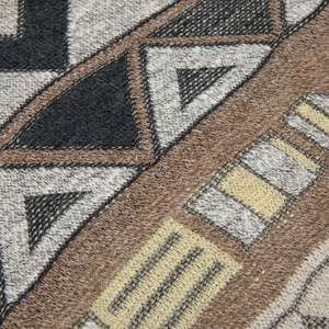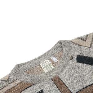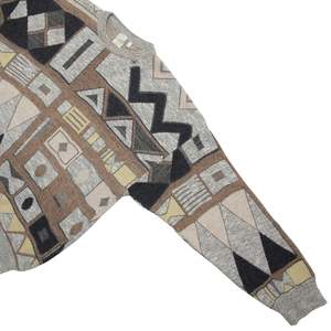 This mens oversized geometric-patterned sweater, dating from the late 1980s to early 1990s, showcases Italian knitwear craftsmanship. Featuring an intricate jacquard-knit design with angular and organic shapes in gray, brown, black, beige, and yellow, it reflects avant-garde design and technical innovation. The sweater has an oversized fit with a classic crewneck silhouette, dropped shoulders, and ribbed trims for shape retention. Constructed using a fully-fashioned knitting method, it demonstrates precision and durability. The fiber composition includes 45% wool, 45% acrylic, 5% cotton, and 5% elastane, optimizing warmth, softness, and resilience. Manufactured in Italy, this piece embodies bold jacquard patterns and postmodern aesthetics.