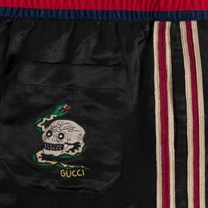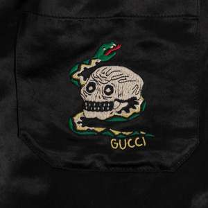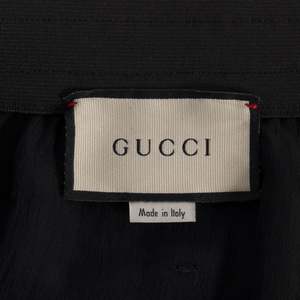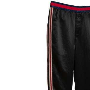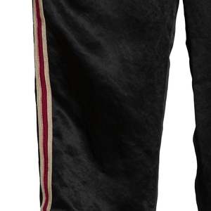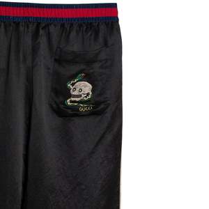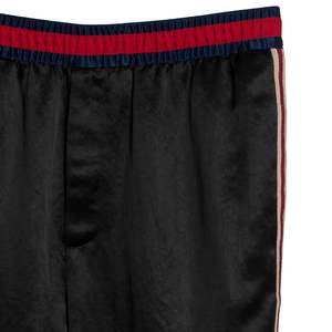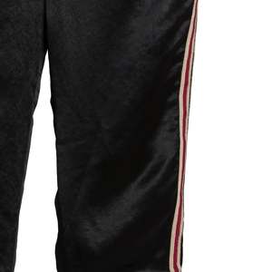 Brand: GUCCI Origin: Italy Condition: Excellent Vintage (no flaws) Look: Absolute Individuality of the Self Department: Men Tag: 52 Size: XL Color: Black Fabric: Satin Material: Acetate Pattern: Balanced Stripe Style: Jogger Leg: Tapered Front: Flat Rise: Mid Body: Oval Waistline: Elastic Closure: Zip Fly Pockets: Inseam Accents: Embroidered Measurements (cm) Waist: 43 Outseam: 84 Inseam: 60 Opening: 19