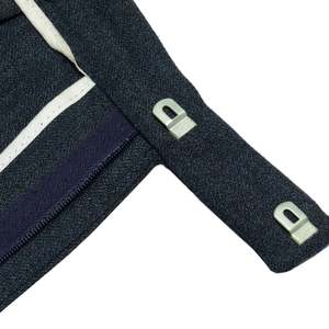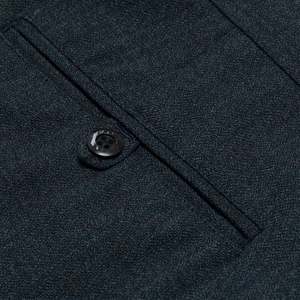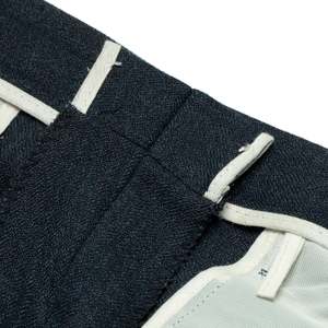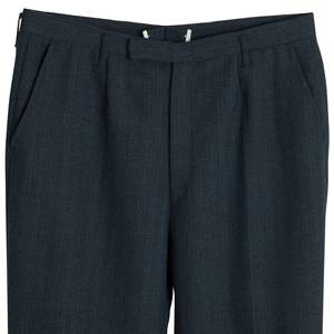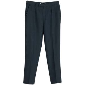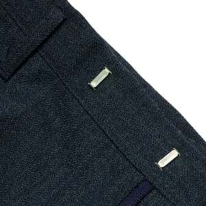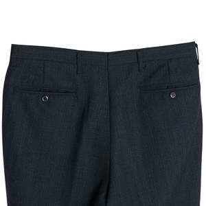 These classic dark wool-blend trousers embody the precision and structural integrity of high-end menswear. Featuring a mid-to-high rise, straight-leg cut with a gentle taper, and a single front pleat for ease of movement, these trousers offer a refined silhouette. Constructed with a reinforced waistband, concealed hook-and-bar closure, and high-quality metal zipper, they ensure durability and a sleek appearance. Made from a 55% polyester and 45% virgin wool blend with a twill weave, the fabric provides durability, subtle sheen, and resistance to wrinkling. The trousers are finished with a blind-stitched hem and welt back pockets with button closures, reflecting meticulous craftsmanship.