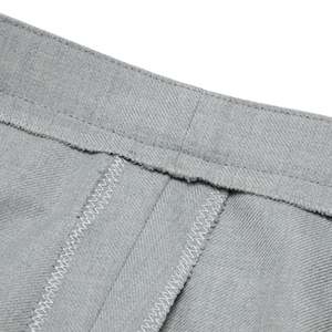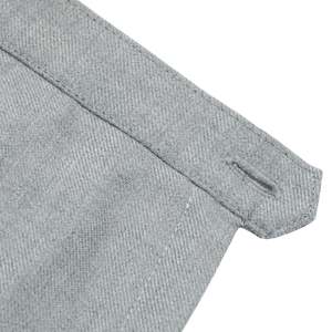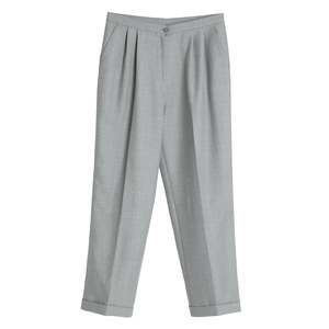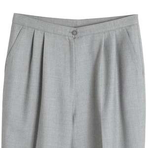 Executed in high-twist tropical wool, the trousers pair ergonomic softness with sartorial claritysutility elevated through proportion. The pleated trousers present a precise and measured interpretation of classic European tailoring, executed with an emphasis on proportion, restraint, and functionality. While devoid of overt branding, the garments constructionmarked by structured pleating, an extended waistband tab, and clean cuffed hemsexudes a language of understated sartorial authority rooted in mid-century Italian and German tailoring traditions. The waistband, lightly fused and extended with a tab closure, pairs seamlessly with the forward-facing pleats, creating a silhouette that allows movement while preserving vertical line integrity. The hem is cuffedsuggesting intentional weight and break distributionreinforcing a refined aesthetic anchored in traditional tailoring codes. The fabric is a plain weave worsted, likely a tropical-weight wool or wool-polyester blend. Its tightly twisted yarn structure produces a smooth, lustrous surface with crisp drape and strong pleat memorysuitable for temperate or warm-weather suiting. Measurements (cm): Waist: 39, Inseam: 71, Outseam: 100, Opening: 23. Size Conversion (approximate): US Womens Size: 8, EU Womens Size: 40, US Mens Size: 30. SKU: 005311.
