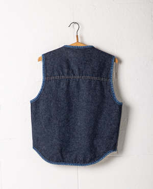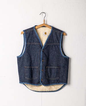 Carhartt lined denim vest in indigo. Hand-picked from American Rag's private vintage collectsion, this fleece-lined vest features front snap buttons, two patch pockets, and contrast piping. Length: 24" Chest: 20"