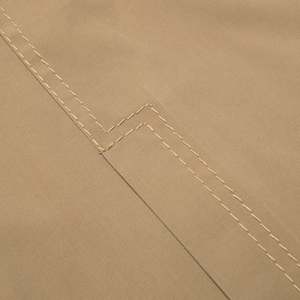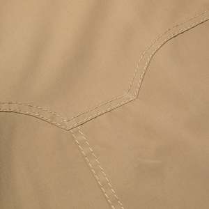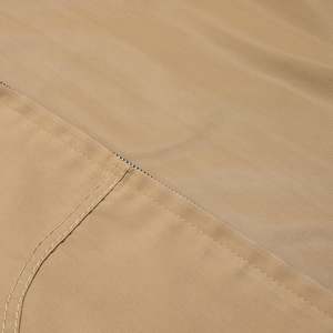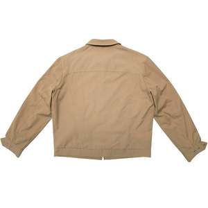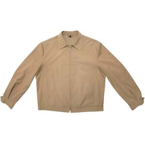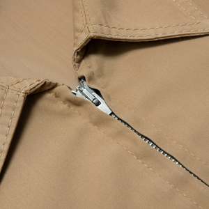 This garment is a tan lightweight utility jacket by Diolen, notable for its clean lines and functional yet minimalistic aesthetic. Designed as practical urban outerwear, the jacket draws subtle inspiration from workwear traditions, offering durability, versatility, and a polished finish. The jacket is a structured utility piece featuring a western-inspired yoke detail and a tailored silhouette that rests just below the hips. Designed for everyday wear, it balances durability with a refined aesthetic suitable for casual and semi-formal settings. The construction incorporates single-needle topstitching for precise detailing along the yoke and seams, reinforced with bar tacks at stress points for added durability. Multi-panel construction with darting enhances the garments structure and fit, ensuring a polished appearance while maintaining comfort and ease of movement. Crafted from a 65% polyester and 35% cotton blend, incorporating Diolen synthetic fibers, the jacket is constructed using a plain weave with a slight sheen, providing a clean, polished finish. The polyester lends wrinkle resistance and lightweight durability, while the cotton ensures breathability and softness. The tightly woven fabric is medium-weight, making it suitable for transitional weather and casual utility-style jackets. Decorative elements include precision-cut western yoke panels, a hallmark of workwear tradition, paired with welt pockets for a streamlined and functional design. A metallic YKK zipper serves as the front closure, ensuring durability and smooth functionality, with concealed stitching at the zipper placket maintaining a seamless appearance. The tailored fit emphasizes the shoulders and chest while allowing freedom of movement through the torso. Ergonomic panel seams enhance both comfort and structure, and flat-felled seams throughout provide a refined finish and increased durability. The cuffs, adjustable with a two-button system, offer customization in fit, while the hemline is slightly curved and reinforced at the corners to prevent wear. Internally, the seams are overlocked for a neat interior finish. The garments functional details include welt pockets, which are both sleek and practical, and a classic pointed collar reinforced with interfacing for a sharp, structured look. The western-style yoke detailing adds visual interest while strengthening the fabric at key stress points. Double topstitching along the yoke and pocket edges ensures consistency and durability, with evenly spaced stitching providing a clean, professional finish. The neutral tan color palette further enhances the jackets versatility, making it a wardrobe staple that can pair effortlessly with a variety of outfits.