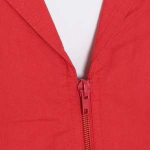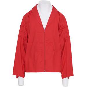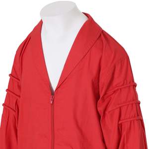 Unbranded yet directional, the midweight outerwear piece channels Neo-Constructivist form through tiered sleeve detail and clean geometry. Produced in West Germany during the 1980s, this fashion-forward outerwear jacket embodies the eras confluence of industrial capability and sculptural experimentation. Though lacking visible branding, it is consistent with output from boutique or mid-market West German labels supplying department stores or export-oriented workshops. The piece reflects a localized design ethos shaped by architectural silhouettes and formal volume, situated within a broader industrial garment culture that, by the 1980s, was channeling directional design cues from Paris, Milan, and Tokyo into commercially viable garments for the urban European consumer. Categorized as a lightweight fashion jacket, this piece was conceived as a transitional outer layer for women navigating professional and social spaces in spring and autumn. Its assertive silhouettea voluminous raglan-sleeved, collarless form punctuated by tiered sleeve detailingplaces it firmly within the visual vocabulary of 1980s power dressing. Yet, unlike the heavily tailored, shoulder-padded iterations of the same period, this garment explores form through surface construction and pattern manipulation rather than traditional tailoring tropes. The garments technical construction aligns with the efficient but thoughtful production methodologies prevalent in Cold War-era West German apparel manufacturing. The body is assembled primarily with lockstitch seams, likely supported by chainstitch reinforcements at high-stress zones such as the sleeve caps and the zipper base. The interior finishing is consistent with regional practicesoverlocked seams (three-thread serger) for durability and production efficiency, and clean facings or mock flat-felled seams around visible areas like the neckline and zipper. One of the defining technical features of this garment lies in its sleeve engineering. The sleeves are constructed as wide raglan panels, gathered subtly at the upper arm and adorned with horizontally applied fabric tubes. These triple-tiered bands are topstitched with precision and may be internally stabilized with interfacing or elastic to preserve structural claritys. Their placement introduces a geometrically disciplined form of surface embellishmentornamental, but never gratuitoussignaling a Neo-Constructivist influence in both pattern logic and visual rhythm. The body itself is cut from minimal panels: a single front and back bodice with no visible darting or princess seams, relying instead on generous ease and the visual weight of the sleeve detail to sculpt the silhouette. The hem falls straight across the hip, with no venting or shaping, reinforcing the garments boxy, layering-friendly cut. Side seams are likely straight, unbroken lines, consistent with the Bauhaus-derived principles of reductionism that subtly informed much of West German fashion modernism. The collar construction eschews traditional structure in favor of a wide, soft shawl collarlikely cut as a separate facing or band collar piecesharply mitred at the center front to create a crisp V-neckline. Topstitched narrowly along its perimeter, the collar is both a visual anchor and a gesture toward modernity: it frames the neckline cleanly without competing with the architectural volume of the sleeves. The zippera color-matched nylon coil variantis inserted via a centered application with symmetrical topstitching, though a slight misalignment at the neckline suggests minimal fabric creep or tension imbalance during installation, a common occurrence in garments assembled without pre-stitched zipper stays. The material selection reinforces the garments transitional utility and structural priorities. The outer shell is a matte plain-weave cotton or cotton/polyester poplin, estimated between 140160 GSMlight enough for ease, crisp enough to hold form, and breathable for seasonal adaptability. It exhibits no surface coating or sheen, indicating a preference for natural texture over synthetic polish. The textile was likely sourced from a German or Italian mill, both of which dominated high-quality shirting-weight fabrics during this period. No knit components are presenta notable divergence from many 1980s jackets that incorporated ribbed cuffs or collars for casual elasticityfurther emphasizing its structured, fashion-oriented identity. Detailing throughout is deliberate and harmonious. The topstitching is consistently narrow and symmetric, particularly around the neckline and zipper placket, providing reinforcement and maintaining visual claritys. The sleeve tucks are uniformly spaced, requiring precise pattern drafting to retain bilateral symmetryespecially important given the sleeves role as the primary sculptural feature. Internally, the collar and neckline are likely interfaced with lightweight fusibles to maintain structure without bulk, while the hem and cuffs are cleanly folded and topstitchedno binding, no facing layersconsistent with German production standards for garments in this category. Conceptually, the jacket articulates a visual strategy of controlled volume and soft assertion. Its absence of buttons, minimal shaping, and rational center-zip closure speak to a design language rooted in modernist efficiency. Yet, the tactile play of the sleeve bands and the exaggerated raglan drape position it within a broader aesthetic movement that sought to reclaim femininity through scale rather than ornament. The piece can be read as soft armor: protective, dimensional, yet fluid. It is aligned with a vision of womanhood in fluxassertive, architectonic, but not beholden to patriarchal tailoring traditions. Artistically, the garment resonates with the aesthetic lineage of Neo-Constructivism. Its horizontal sleeve architecture and sharp V-shaped neckline form a visual grid of tension and symmetry. The minimalist torso contrasts with the maximalist sleeves, 