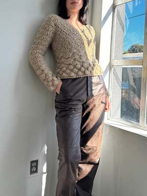Super soft vintage leather dark brown trousers with a beautiful patina. High waisted, with pleats and two front pockets. In great condition. Made in Italy. MEASUREMENTS in inches Waist 31 Hips 42 Inseam 31 Rise 13 MATERIALS Leather, acetate lining All items are FINAL SALE. Vintage pieces are pre-loved and may come with minor flaws; condition will be noted in description.