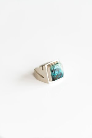 Modernist square signet ring with a large, striking, smokey turquoise stone and cutout details on the band. - Sterling Silver + Turquoise - ca. 1960 - Size 7.5 A selection of hand picked vintage and antique items has always been an important part of Reliquary's unique assortment of goods. We travel near and far to bring you a collectsion of one of a kind pieces, with rich and inspiring histories, just waiting for you to add the next chapter... Please note, signs of wear and other irregularities are evidence of these item's colorful past and, we feel, add to their individual charm. We hope you agree.