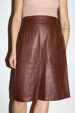 Butter-soft tan grain leather skirt, fully lined with a back vent. Flat waistband with concealed side zip fastening. Size on label: EU 40, suggested size: UK 10/12. Measurements: Waist 2829", hips 36", length 24". Material: 100% leather. Sourced in France. Good vintage condition. Model wears a UK size 8 and is 5'8" tall.