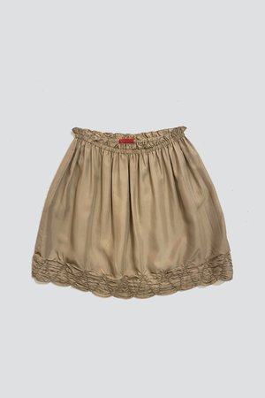 Vintage Prada Silk Taupe Rouche Skirt from Assembly New York. Elastic waistband. - Width 25" - 28" / Length 16"