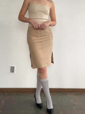 Neutral beige textured skirt with fun zipper details. Beautiful construction, with two zip pockets at front, and two long zippers at either side that can be adjusted and styled a multitude of ways. In excellent condition. Made in Italy. MEASUREMENTS in inches Waist 31 Hips 38 Length 23.5 MATERIALS Cotton, viscose, elastine. All items are FINAL SALE. Vintage pieces are pre-loved and may come with minor flaws; condition will be noted in description.