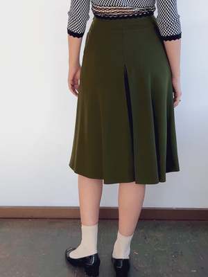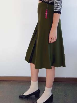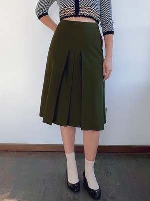 Vintage Cacharel Paris olive green wool A-line skirt. Fully lined with box pleating at the center front, a single box pleat at the center back, and a side zip closure. In excellent condition with tag still attached. MEASUREMENTS (in inches) Waist: 27.5 Hips: 42 Length: 29.5 MATERIALS Wool All items are FINAL SALE. Vintage pieces are pre-loved and may come with minor flaws; condition will be noted in the description.