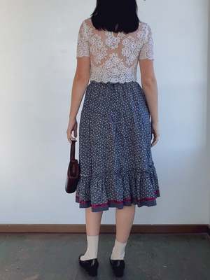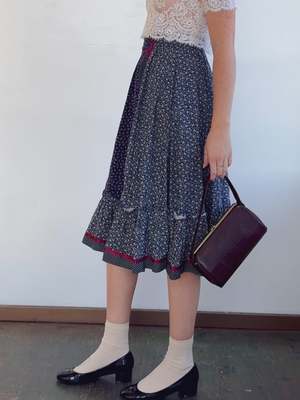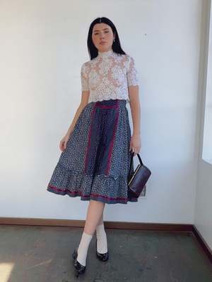 Vintage Gunne Sax navy blue floral paneled prairie skirt with ruffle and ribbon trim. Center back zip closure. In great condition. Marked size 11. MEASUREMENTS in inches Waist: 28 Hips: 44~ Length: 32 MATERIALS Feels like a cotton blend. All items are FINAL SALE. Vintage pieces are pre-loved and may come with minor flaws; condition will be noted in the description.