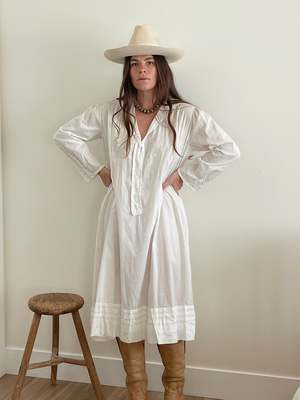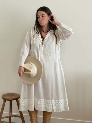 Antique bow embroidered nightgown with button Henley and pleated hem. Approximately 100+ years old with several tiny holes, priced as-is. Size: Mediumlarge based on desired fit All measurements taken flat: - Bust: 23" - Length: 45" - Shoulder: 19" - Arm hole: 9" Color: White Material: Cotton Madison is 5'7" and size medium. All items are preloved or vintage, so they might show signs of minor wear. Anything major will be noted and photographed. All sales final.