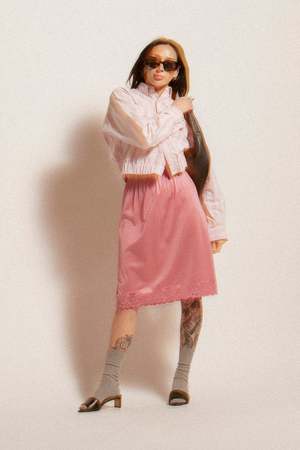 A little something sweet for spring! - 100% nylon - Fits like a S/M - Three seams, no slits - Lace detail at the bottom - Machine washable Size & Fit Fits like a S/M. Model is 5'3" and wears a size S. Waist: 25" unstretched to 28" stretched. Hips: 42". Length: 23".