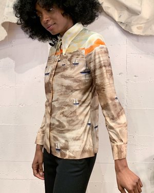 Sail alway in this soft nylon buttondown MEASUREMENTS 38" bust 35" waist 25" length MATERIALS 100% nylon
