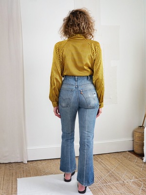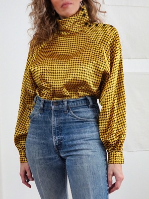 Vintage 80's blouse. Amazing turmeric color, contrasted by ink black in a silky fabric that glides over the body. Button up neck into a high collar can also be left loose and folded over. Long, dolman sleeves with button on wrist. Padded shoulder. Side slits on hem. details circa: 1980's material: polyester measurements size: 8 fits like: small + medium bust: 40 inches shoulder: 17 inches sleeve: 24 inches waist: 38 inches length: 25 inches condition very good Fabric shows some gentle wear.