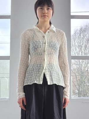 Gorgeous vintage Issey Miyake Fete white pleated blouse with a polka-dotted pattern and silver bauble buttons. Excellent condition. MEASUREMENTS (in inches) 34 in bust 30 in waist 23.5 in length MATERIALS 100% polyester All items are FINAL SALE. Vintage pieces are pre-loved and may come with minor flaws; condition will be noted in the description.