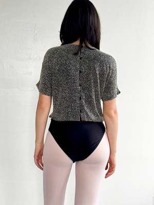 Vintage 90s silver beaded black silk crew neck bodysuit. Button closure at the back, with short sleeves and black spandex brief attached with snap closure. In excellent condition. MEASUREMENTS in inches Bust 40 Waist 30 Length 28 MATERIALS Shell: 100% silk Lining: rayon Bodysuit: 80% nylon, 20% spandex All items are FINAL SALE. Vintage pieces are pre-loved and may come with minor flaws; condition will be noted in description.