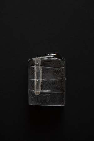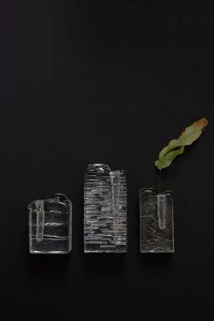 Heavy glass, off-centre single stem vases with textured finish. May also work with narrow candles. S: 10x7cm M: 11x6cm S: 15x7.5cm Made in Germany. Excellent vintage condition. Each sold separately.