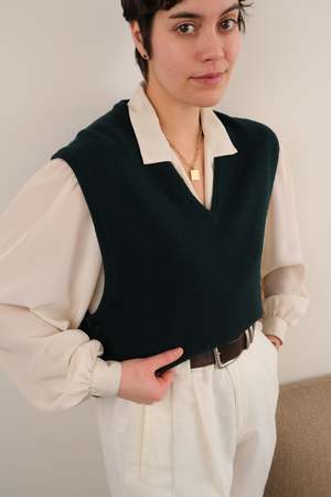 This dark green sleeveless sweater vest is made from 100% lambswool with a soft knit finish and a clean V-neckline. The vest has a straight, relaxed silhouette designed to layer easily over woven tops or lightweight knits. The wool construction gives it gentle structure while maintaining a classic, understated appearance. Pairs naturally with tailored trousers or layered over crisp blouses for a balanced, versatile look. Tag size reads L. Chest: 42 in. Length: 39 in. Model is a US size 4 and stands at approximately 5 feet 8 inches. Although we do our best to ensure each item is in excellent condition, please respect any minor flaws due to the item's vintage character. Color may vary slightly due to lighting and screen settings. Measurements are approximate.