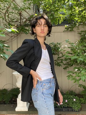 Cotton double breasted notch collar 1990s blazer. Size 34. Measurements laying flat and buttoned; Shoulders 16" Underarm to underarm 18" Sleeve 23" Waist 17" Hips 19.5" Length 29" Dry clean