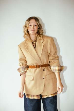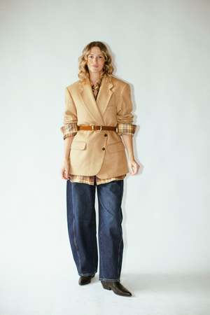 Perfectly polished. Fits like a modern L/XL. Relaxed fit. Bust: 46" Length: 32" Unknown, feels like a wool blend. Dry clean only.