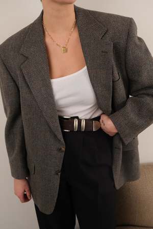 Brown wool blazer with a relaxed tailored silhouette and a dense textured weave. Designed with a notched lapel, front button closure, and flap pockets that give it a structured, classic appearance. Pairs naturally with pleated wool trousers or classic denim jeans. Made in USA. Fits up to L. Measurements: Shoulder: 19 in. Chest: 44 in. Sleeve: 22 in. Length: 30 in. Model is a US size 12 and stands at approximately 5 feet 8 inches. Although each item is carefully inspected, there may be minor flaws due to the item's vintage character. Vintage 1990s brown wool blazer with a textured weave, notched lapel, and classic tailored silhouette.
