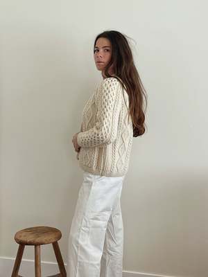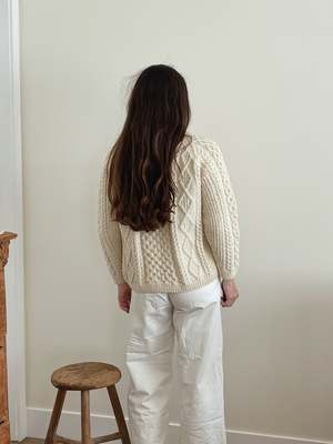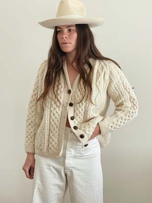 Handknit wool fisherman cardigan with a boxy, cropped fit. Size: Extra smallmedium depending on desired fit. All measurements taken flat: - Pit to pit: 22" - Length: 24" - Shoulder: 18" Color: Cream Material: Wool Model: Madison is 5'7" and wears a medium. All sales final.