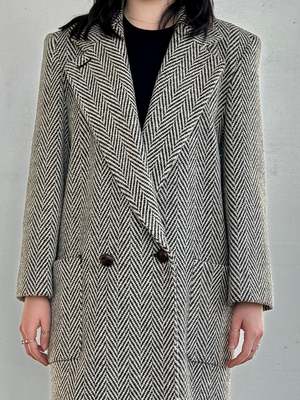 Amazing vintage Perry Ellis Portfolio black and white herringbone tweed overcoat. Oversized menswear shape with a long notched lapel, overlapping double-breasted button closure, two front patch pockets, and a vent in back. Union made in USA label attached. In excellent condition. MEASUREMENTS in inches Bust: 44 Waist: 44 Hips: 44 Length: 51 All items are FINAL SALE. Vintage pieces are pre-loved and may come with minor flaws; condition will be noted in the description. Type: Coat