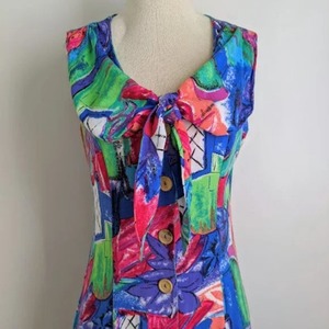 brand: Carol Wior material: rayon closure: button front features: sailor inspired neckline with tie ruffle, unlined, faux wood buttons down front of dress labeled size: unmarked - best fits S-M 36" bust 30" waist 48" hips 47" length model size: 34-26-36 condition: excellent. normal signs of wear throughout, no flaws to note.