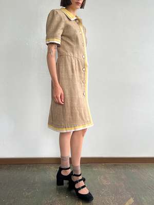 Vintage Valentino boutique dress. Brown with white and yellow accents and buttons up the front. Fully lined. Made in Italy and in excellent vintage shape. MEASUREMENTS (in inches) 36 in bust 29 in waist 38 in hips 40 in length MATERIALS Feels like raw silk All items are FINAL SALE. Vintage pieces are pre-loved and may come with minor flaws; condition will be noted in description.
