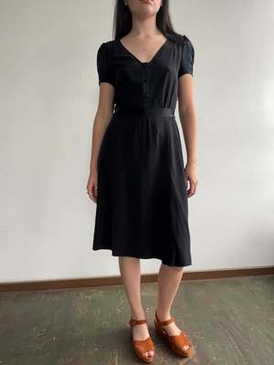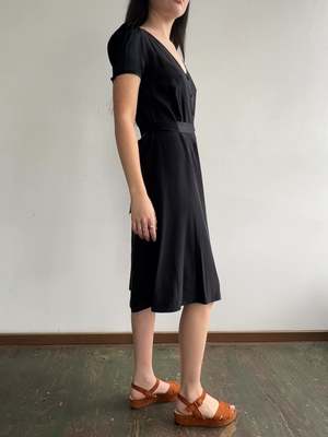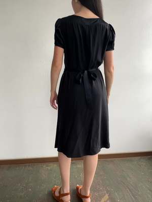Marc Jacobs black silk cap sleeve dress with v-neck and buttons down the bodice. Includes a silk waist tie that is attached with belt loops. In great condition. MEASUREMENTS in inches Bust 40 Waist 33 Hips 44 Length 44 MATERIALS Silk All items are FINAL SALE. Vintage pieces are pre-loved and may come with minor flaws; condition will be noted in description.