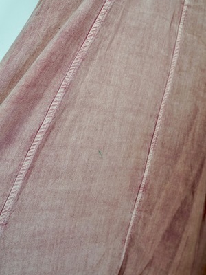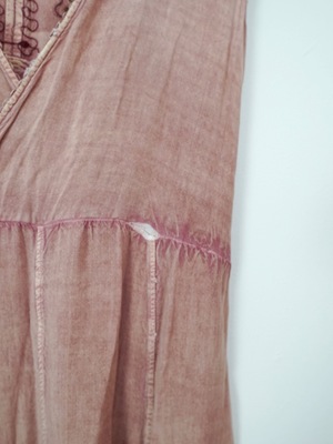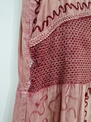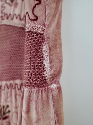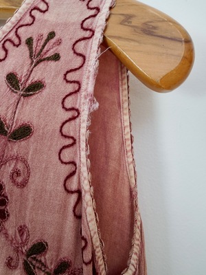 Vintage 70's sun dress featuring sun-washed rose tones and thread-worn florals. Sleeveless tank style in a knee length with an overlapping v-shaped back. Made of soft cotton with an easy drape and knitted waist detail. Embroidered designs and blooms throughout. Circa: 1970's Material: Cotton Measurements: Size: Large Fits like: Medium Bust: 36 inches Waist: 34 inches Hip: 44 inches Length: 36 inches Condition: Good; shows overall wear and fabric distressing, missing embroidery in areas, and numerous repairs made by hand.
