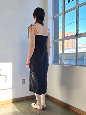 Gorgeous vintage Equipment pure silk black dress with delicate tie straps. Side zip closure. Lined, marked size S. Excellent condition. MEASUREMENTS (in inches) 34 in bust 31 in waist 42 in hips 41 in neckline to hem, adjustable straps in length MATERIALS Silk, lined All items are FINAL SALE. Vintage pieces are pre-loved and may come with minor flaws; condition will be noted in the description. Type: Dress