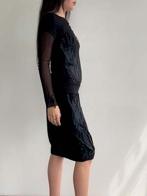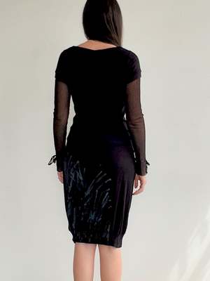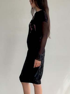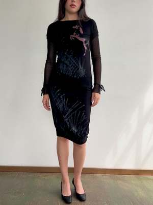 Italian-made deconstructed dress with sparkly maroon horse printed across the chest and abstract paint marks throughout the piece. Dress has a rib knit neckline, along with a stretchy rib knit dropwaist and hemline. Sleeves are long and made with a black lace that are tied at the wrist with a small black bow. In good condition. MEASUREMENTS in inches Bust 30 Waist 30 Hips 30 but stretches to 28 Length 46 MATERIALS Viscose, elastane, nylon All items are FINAL SALE. Vintage pieces are pre-loved and may come with minor flaws, condition will be noted in description.