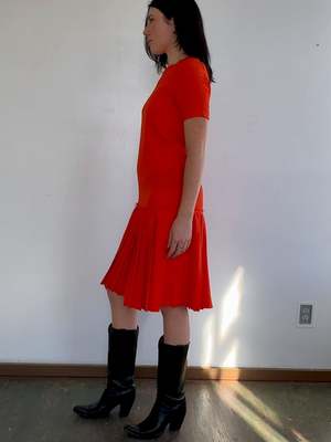 Vibrant red-orange deconstructed drop waist dress from YMC. Features raw edge details, a crew neck, small chest pocket, and pleated skirt. Button closure at the back of the neck. In great condition. MEASUREMENTS (in inches) Bust: 36 Waist: 34 Hips: 40 Length: 41.5 MATERIALS Feels like a synthetic. All items are FINAL SALE. Vintage pieces are pre-loved and may come with minor flaws; condition will be noted in the description.
