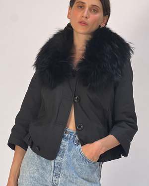 Vintage black nylon Moschino jacket with fun fur trimmed collar. MEASUREMENTS (in inches) 38 in bust 42 in waist 40 in hips 22 in length MATERIALS Nylon/Fur