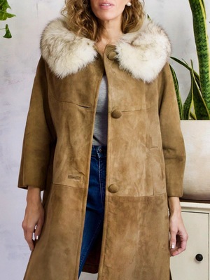 Vintage 60's coat. Made of super buttery soft, coffee colored suede. Trimmed in a fluffy, genuine fox fur collar with hook and eye details so it can be worn fully closed around the neck to keep the chill out. Single breasted style in an a-line shape, with suede covered buttons and three quarter length sleeves. Belted waist wraps around front. Side, slit pockets. Fully lined. details circa | 1960's material | suede + fox fur measurements size | 10 fits like | medium bust | 44 inches shoulder | 18 inches sleeve | 19 inches waist | 44 inches hip | 52 inches length | 34 inches condition very good + belt shows some wear and loose stitching (see close up pic for detail)