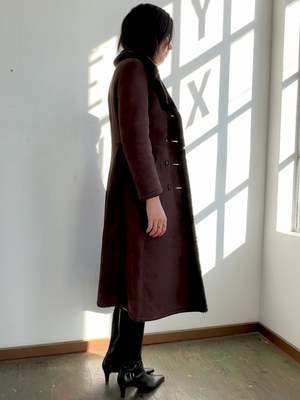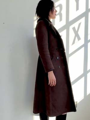Amazing cozy vintage seventies dark chocolate suede shearling 3/4 length coat. Double breasted with horn buttons and two pockets. In excellent condition. MEASUREMENTS in inches Bust 36 Waist 30 Hips 41 Length 46 MATERIALS Shearling All items are FINAL SALE. Vintage pieces are pre-loved and may come with minor flaws; condition will be noted in description.