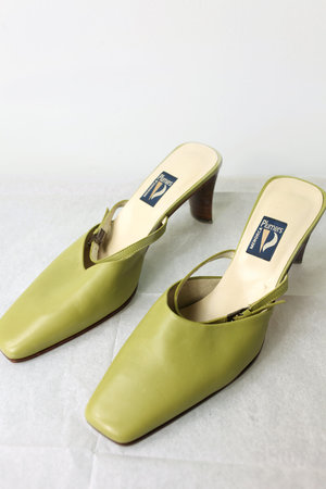 A pair of leather 'Plumers' vintage closed square toe mules with a buckle fastening and block heel. VINTAGE - Olive - Size UK 7 - Width at ball of foot: 13cm. Length of sole: 25cm, heel height: 7cm - Made in Spain As vintage items are pre-loved please expect some wear, fading or any other abnormalities that add to their character.