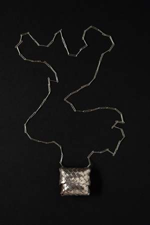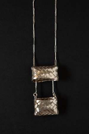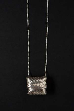 Woven sterling silver basket that opens by the lid sliding up the fine long chain. Clasp-less and long enough to go over your head. Chain: 71 cm Basket measures: 3.5 x 3 cm 925 silver Sourced in Mexico City.