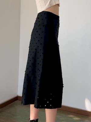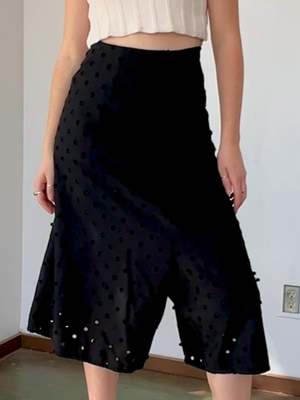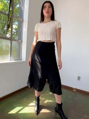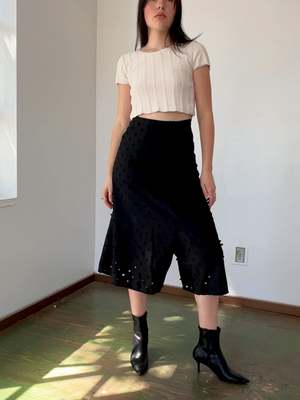 Yojhi Y's black skirt pants with polka-dot cut-out detailing throughout. Single pocket on the left side. Fully lined with a side zip closure. The leg openings are asymmetrical so that the right leg is wider than the left. In excellent condition with tags still attached. MEASUREMENTS (in inches) Waist: 29 Hips: 42 Length: 33 Inseam: 10 Rise: 23 MATERIALS Feels like a wool blend. All items are FINAL SALE. Vintage pieces are pre-loved and may come with minor flaws; condition will be noted in the description.