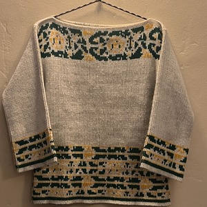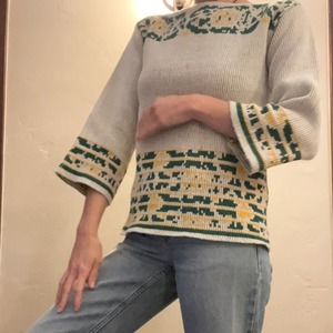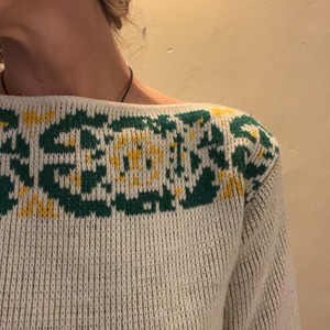 60s Vintage Wool Knit Boat Neck - Poor Boy Sweater - Women's style - Ivory, Forest Green / Yellow Floral Print - 3 / 4 Flared Sleeve - 36"Bust, 24"Length - 100% Wool