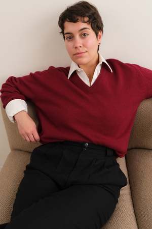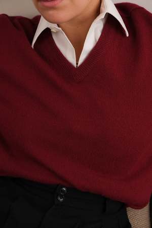 This vintage 1980s pullover sweater is crafted from deep burgundy wool, offering a warm, softly structured texture with a smooth, midweight feel. It features a classic v-neckline and fine ribbed cuffs and hem for tailored simplicity that layers effortlessly across seasons. Made in the USA. Tag size: L Shoulder: 20 in. Chest: 43 in. Sleeve: 26 1/2 in. Length: 24 1/2 in. Model is a US size 2 and stands at approximately 5 feet 8 inches. Please note minor flaws may be present due to the item's vintage character.