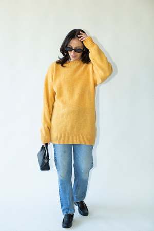 Cozy and chic. Fits like a modern size L. 100% Wool Made in Scotland Hand wash or dry clean Note: May be itchy if sensitive to wool Long, relaxed fit. Armpit to armpit: 22"