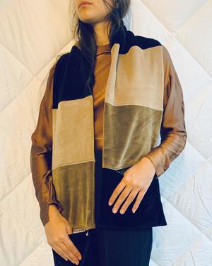 A cozy stylish scarf you can store things in! Vintage Sonia Rykiel double layer velour stripe scarf with two zip pockets for some of your essentials. MEASUREMENTS 9" wide 69" long MATERIALS 54% cotton 27% rayon 19% nylon