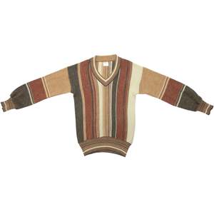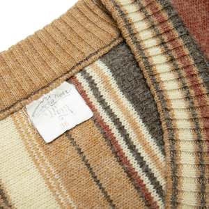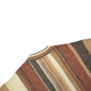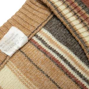This vintage V-neck sweater showcases a masterful balance of structure, color, and texture, embodying a distinctive 1970s aesthetic. The multi-tonal striped pattern, composed of warm earth tones such as beige, brown, olive, and ivory, demonstrates a refined application of traditional knitting techniques while reflecting the eras embrace of bold knitwear patterns and textured layering. With its heavyweight wool composition and oversized silhouette, the sweater offers both durability and a relaxed yet structured drape, making it a versatile layering piece. Fabric: Knit. Composition: 60% Polyacryl 40% Schurwolle. Measurements (cm): Chest: 42, Length: 60, Shoulder: 40, Sleeve: 55. SKU: 004932.